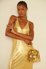Bolsa estilo saco com forte apelo fashion, ideal para compor produções sofisticadas e contemporâneas. Confeccionada em base têxtil com aplicação abundante de lantejoulas e franjas metálicas douradas, a peça cria um efeito luminoso e elegante, perfeito para ocasiões especiais. O acabamento artesanal garante textura, movimento e destaque ao acessório. Possui alça fina para uso no ombro ou transversal, além de fechamento por ajuste superior, que une praticidade e charme.