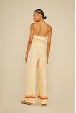 A Calça Estampa La Beduine é sinônimo de leveza e sofisticação. Com modelagem ampla e fluida, ela garante movimento e conforto em cada passo. A estampa em tons suaves de amarelo e off-white, com detalhe em degradê terroso na barra, traz o charme único e atemporal da peça. Combine com rasteiras para um look descomplicado ou aposte em acessórios dourados para um visual sofisticado e moderno.
