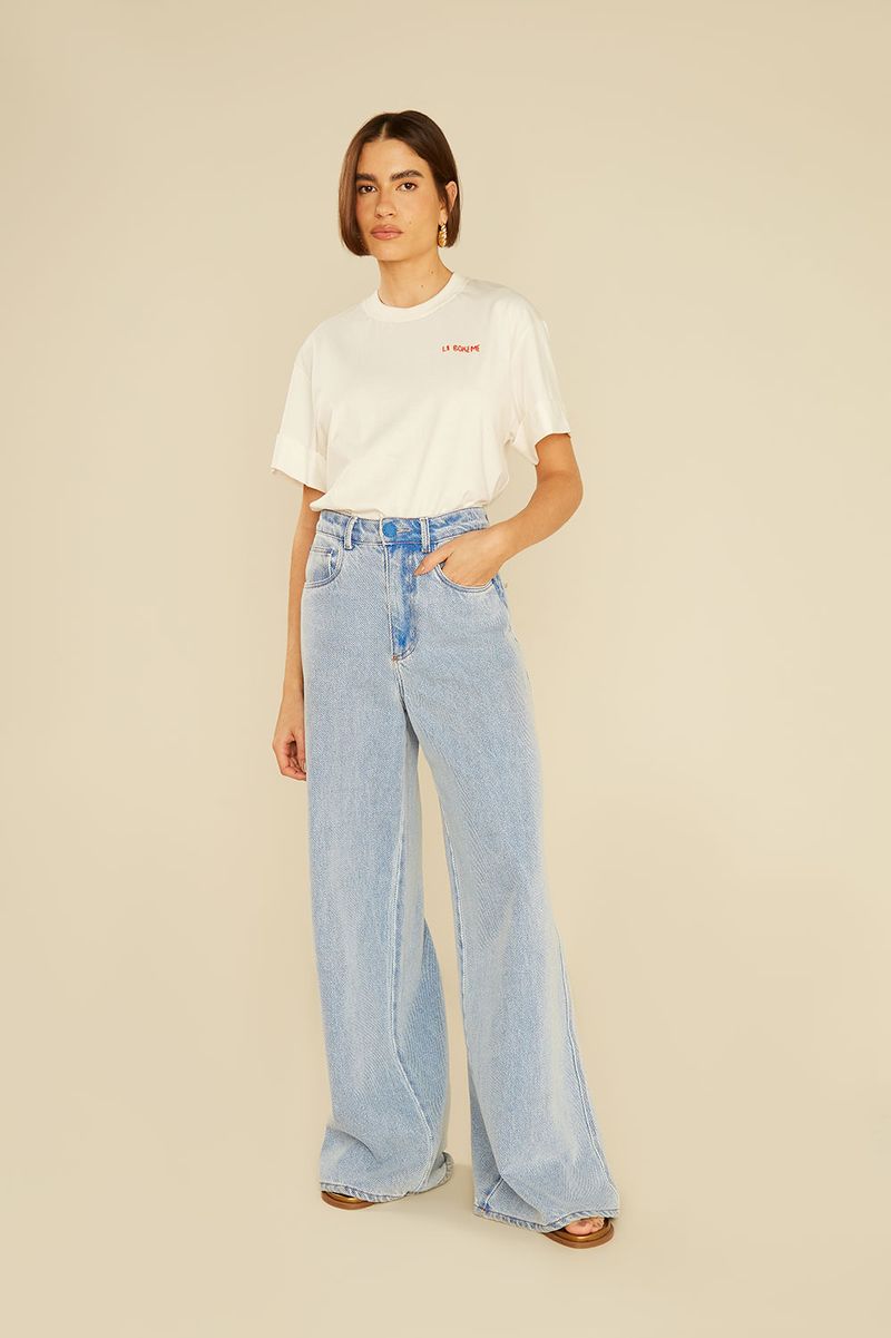 A Calça Jeans Emily é uma peça casual e atemporal, perfeita para diversas ocasiões. Com comprimento longo e barra ampla, ela traz um toque moderno e confortável ao visual. A cintura de cós alto, com passantes e botão azul, valoriza a silhueta, enquanto os bolsos laterais e posteriores garantem funcionalidade. Versátil e cheia de estilo, a Emily é ideal para composições do dia a dia com personalidade.