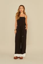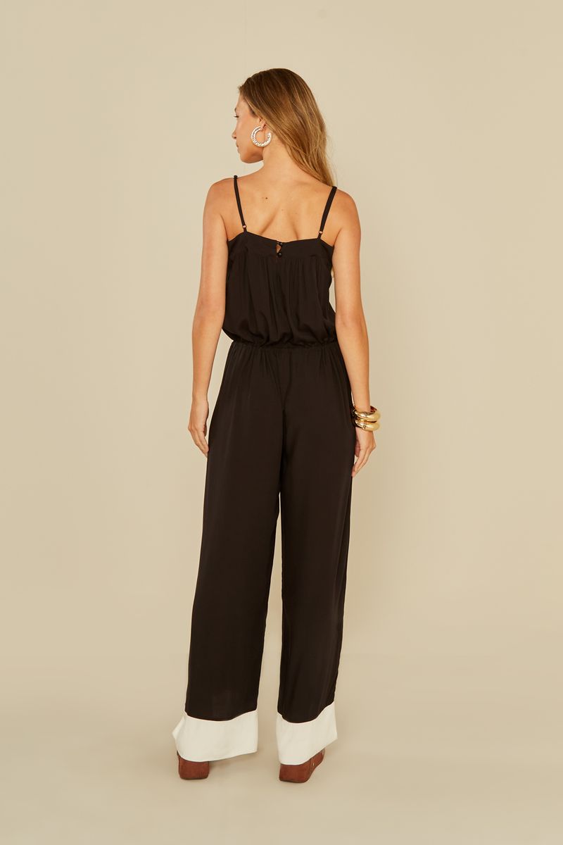 O Macacão Decote Reto é confeccionado em tecido leve e fluido, trazendo conforto e sofisticação em uma só peça. Possui modelagem ampla com caimento solto, decote reto com alças finas ajustáveis e detalhe de amarração na cintura para melhor ajuste. O barrado contrastante em tom off white adiciona modernidade e estilo ao visual.