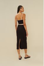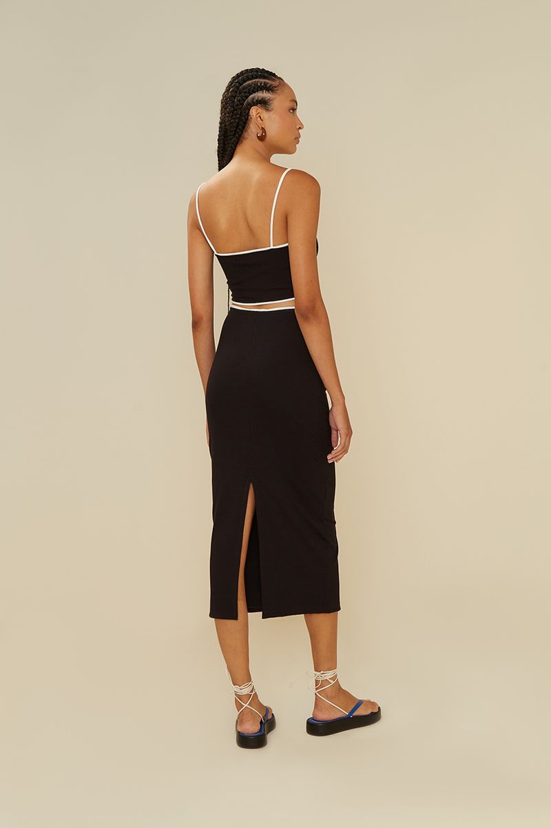 A Saia Malha, com seu estilo casual, é perfeita para criar uma variedade de looks. Esta peça elegante possui comprimento midi e um corte reto, além de uma cintura de cós alta, destacada por um sofisticado detalhe em viés branco, que valoriza ainda mais a silhueta.