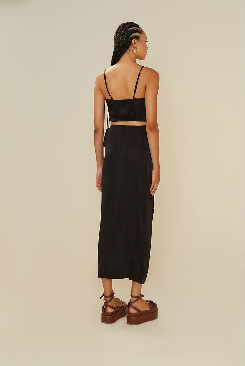 Com um design elegante e versátil, a saia midi é perfeita para complementar uma variedade de looks. Apresenta uma amarração lateral adornada com delicadas franjas, cintura de cós alto que valoriza a silhueta e um elegante transpasse, acrescentando um toque de sofisticação a qualquer ocasião