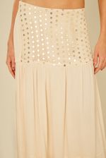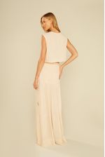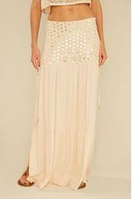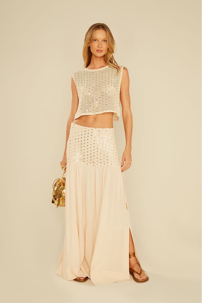 A Saia Bordado confeccionada em tecido leve com aplicação de tela bordada na parte superior, que confere brilho sutil e acabamento sofisticado. O modelo apresenta cintura alta e caimento fluido, proporcionando movimento e elegância ao caminhar. A fenda lateral adiciona feminilidade e leveza à peça, enquanto o contraste entre a textura do bordado e a fluidez do tecido cria um visual refinado e atual. Ideal para produções elegantes, eventos ao ar livre ou composições de verão com toque artesanal.