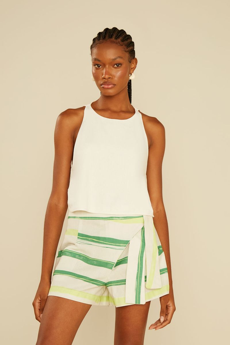 O Short Estampa O Ritmo combina frescor e estilo em uma peça leve e contemporânea. Confeccionado em tecido de linho misto, possui modelagem soltinha e confortável, ideal para os dias mais quentes. Sua estampa com listras em tons de verde e amarelo suave traz um ar tropical e descontraído, enquanto o detalhe transpassado frontal com amarração lateral adiciona charme e movimento ao visual. Perfeito para composições casuais ou sofisticadas, é uma escolha versátil para o verão.