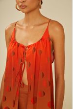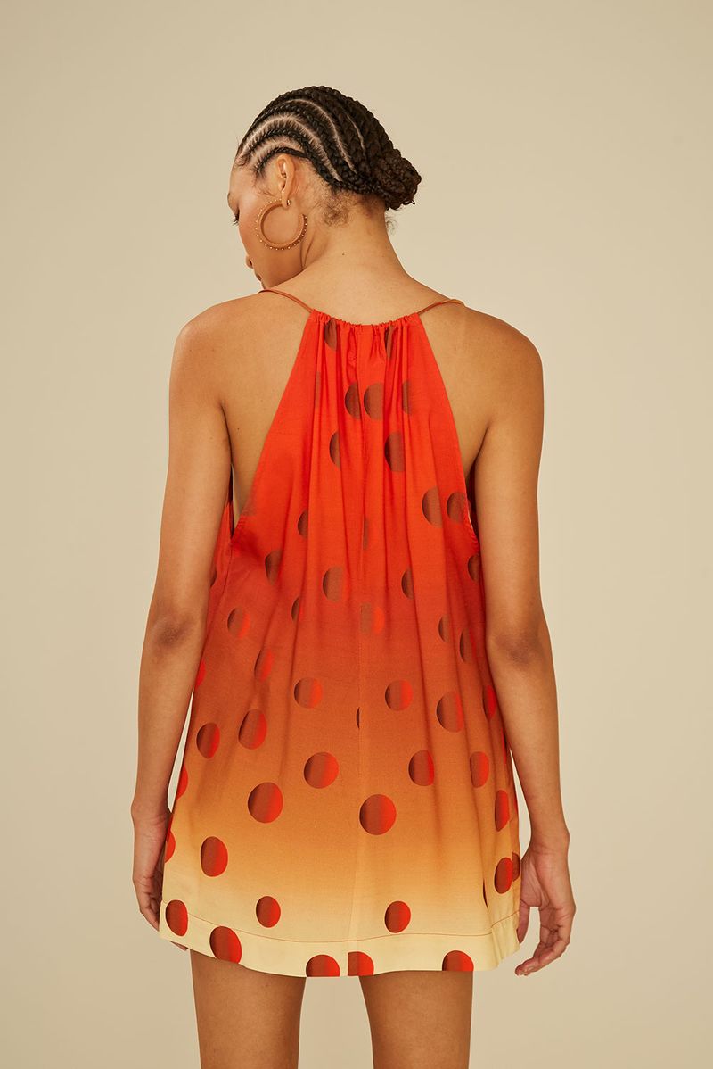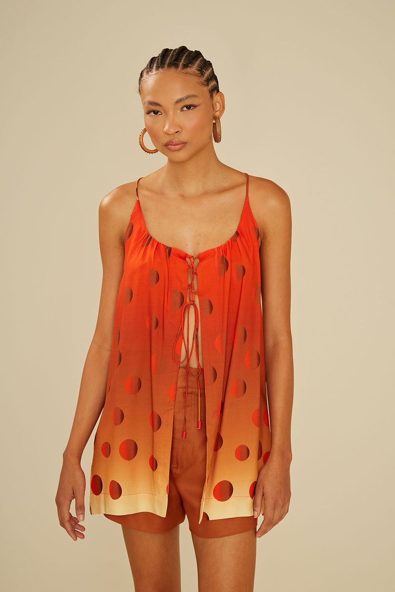 A Túnica Estampa Poá Dune Curto é leve, fluida e perfeita para compor looks descomplicados e cheios de estilo. Com estampa de poás em efeito degradê, que transita do laranja vibrante ao bege suave, a peça transmite frescor e modernidade. O decote com amarração frontal e as alças finas trazem delicadeza, enquanto o caimento soltinho garante conforto e movimento. Ideal para usar sobre biquínis, com shorts ou calças leves, é a escolha certa para dias ensolarados e produções de verão cheias de charme.