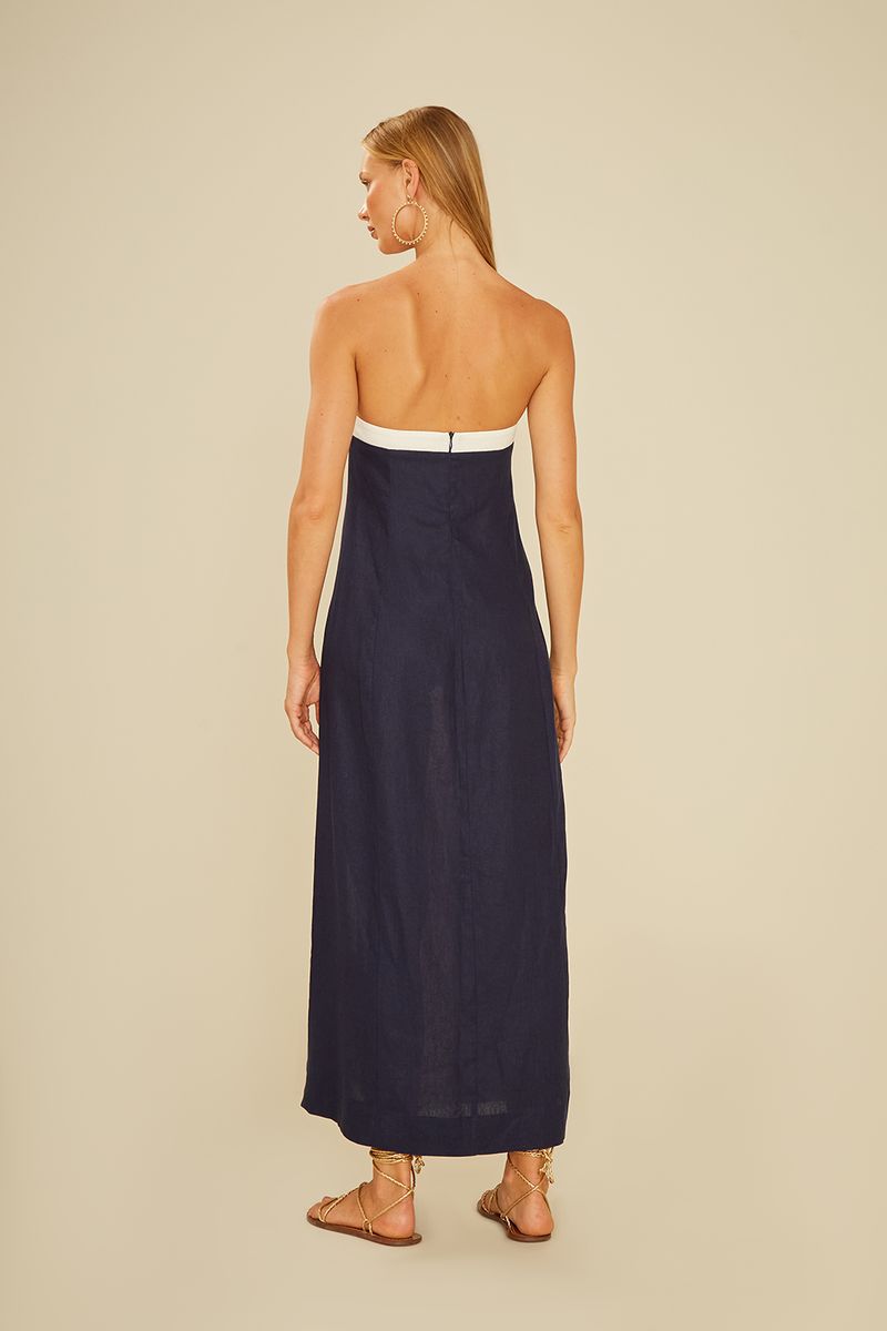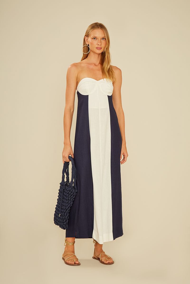 O Vestido Decote Corpete combina elegância minimalista com um toque moderno, perfeito para quem busca um visual sofisticado sem esforço. Com modelagem longa e caimento leve, ele valoriza a silhueta através do busto estruturado em estilo corpete, que destaca o colo com delicadeza e segurança. O design bicolor cria linhas verticais que alongam o corpo, trazendo um efeito visual elegante e contemporâneo. O modelo tomara que caia garante frescor e leveza, ideal para dias quentes e ocasiões especiais — desde passeios à beira-mar até eventos ao pôr do sol. Versátil e confortável, o vestido é confeccionado em tecido leve e fluido, proporcionando movimento natural e toque agradável. Combine com sandálias rasteiras para um look casual chic ou com acessórios marcantes para um visual mais sofisticado.