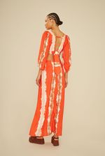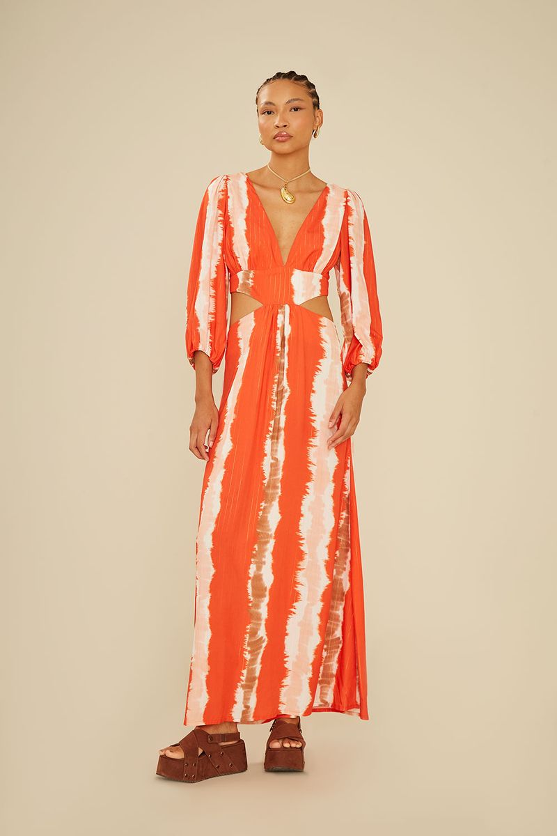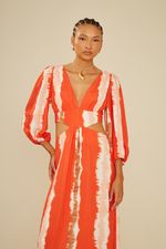 O Vestido Estampa Caminho Solar é a união perfeita entre frescor e sofisticação. Com modelagem longa e fluida, possui decote profundo e recortes laterais que valorizam a silhueta de forma elegante. As mangas 3/4 bufantes acrescentam um toque romântico, enquanto a estampa tie-dye em tons vibrantes de laranja, branco e terroso traz energia e leveza ao visual. Ideal para ocasiões especiais de verão, combina estilo, conforto e um ar descontraído-chique.