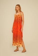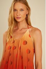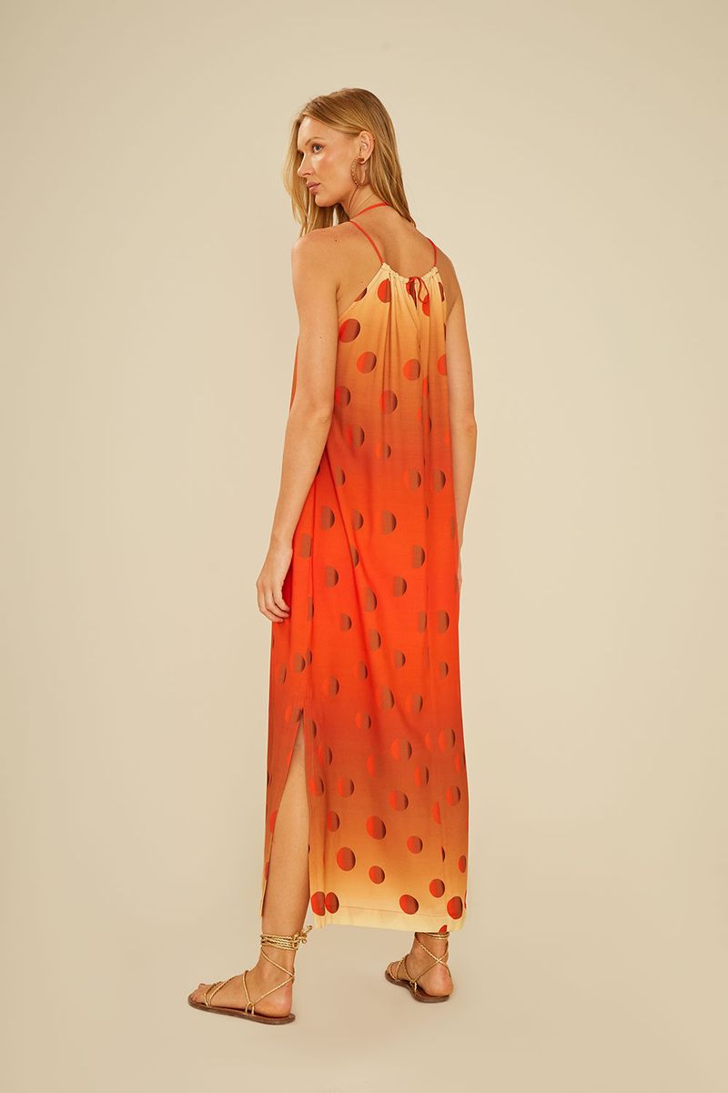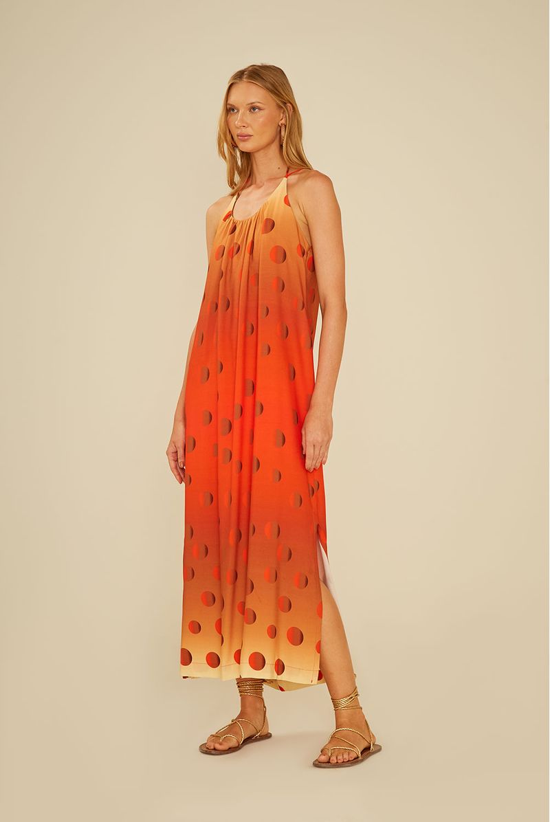 O Vestido Estampa Poá Dune Midi é a escolha perfeita para quem busca leveza e estilo em uma única peça. Com modelagem solta, fendas laterais e caimento fluido, oferece movimento e conforto para os dias quentes. A estampa de poás em degradê, que vai do laranja vibrante ao bege suave, garante um visual moderno e sofisticado. O decote halter com amarração nas costas traz um toque delicado, tornando-o ideal tanto para passeios à beira-mar quanto para produções casuais.