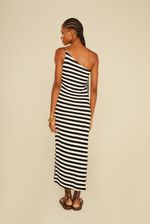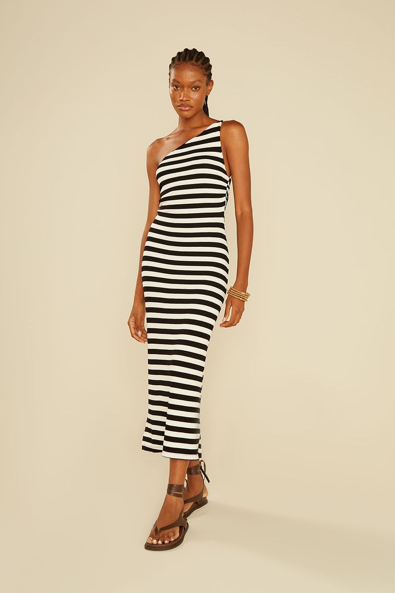 O Vestido Malha Listras combina elegância e conforto em uma peça atemporal e cheia de personalidade. Com modelagem ajustada e comprimento midi, ele valoriza a silhueta com sofisticação e modernidade. O design assimétrico de um ombro só traz um toque de ousadia equilibrado pelas listras horizontais em preto e off white, que criam um visual contemporâneo e marcante. Confeccionado em malha encorpada e flexível, o vestido oferece caimento impecável e conforto durante todo o dia — ideal para ocasiões que vão do almoço casual à produção noturna com charme.
