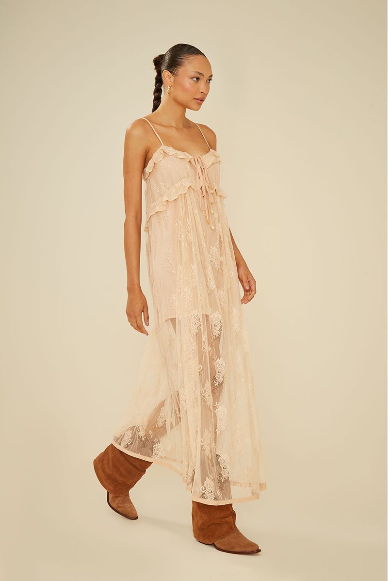 Vestido Midi Babados e Fenda - Areia Quente